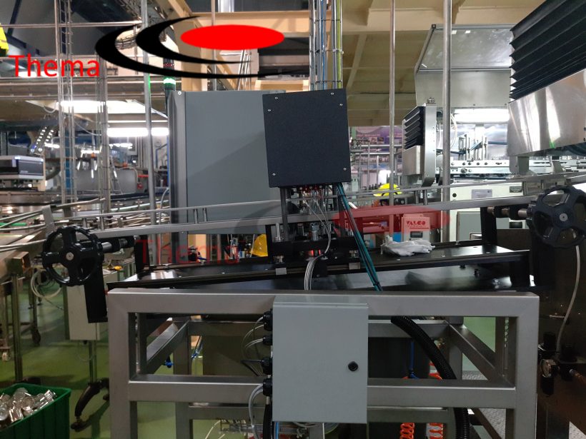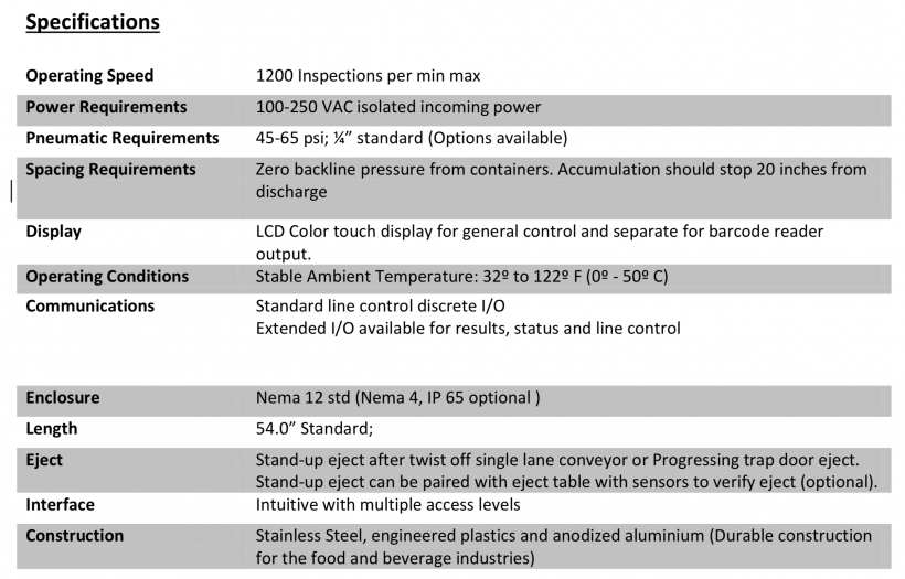 This machine can also be complimented by a Variety Code inspection system (Can Code OCV) that verifies the inkjet printer code on the end of the can and matches it to data read by the barcode reader. Using both the barcode reader and the Can Code OCV verifies that the label matches the product in the can, virtually eliminating the possibility of incorrect labels being applied. If defects exist, the can is ejected from the line by one of two methods. First method is two eject after it is stood up after a can twist and the second is by an integrated progressing door eject system.