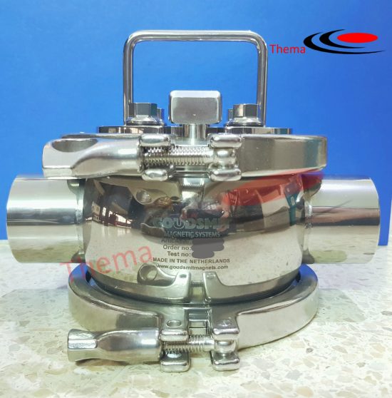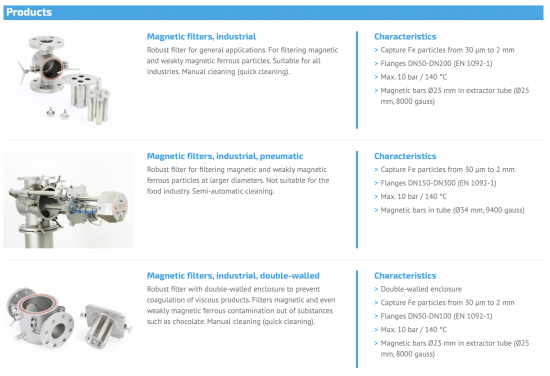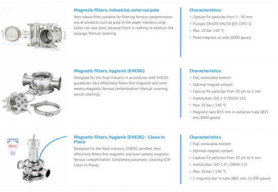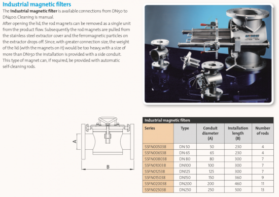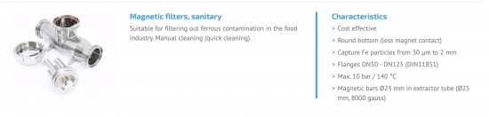 The product, contaminated with ferromagnetic metal particles, passes one or more very strong Neoflux® magnet bars while flowing through the rotating clean flow magnet.