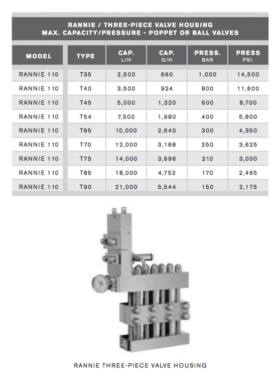 • Square plunger seals and ceramic plungers (Rannie valve housing only)