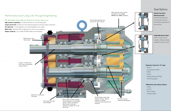 • Unique mechanical seal design utilizes common parts for inner and outer seal seats and rotary seals in a compact design.